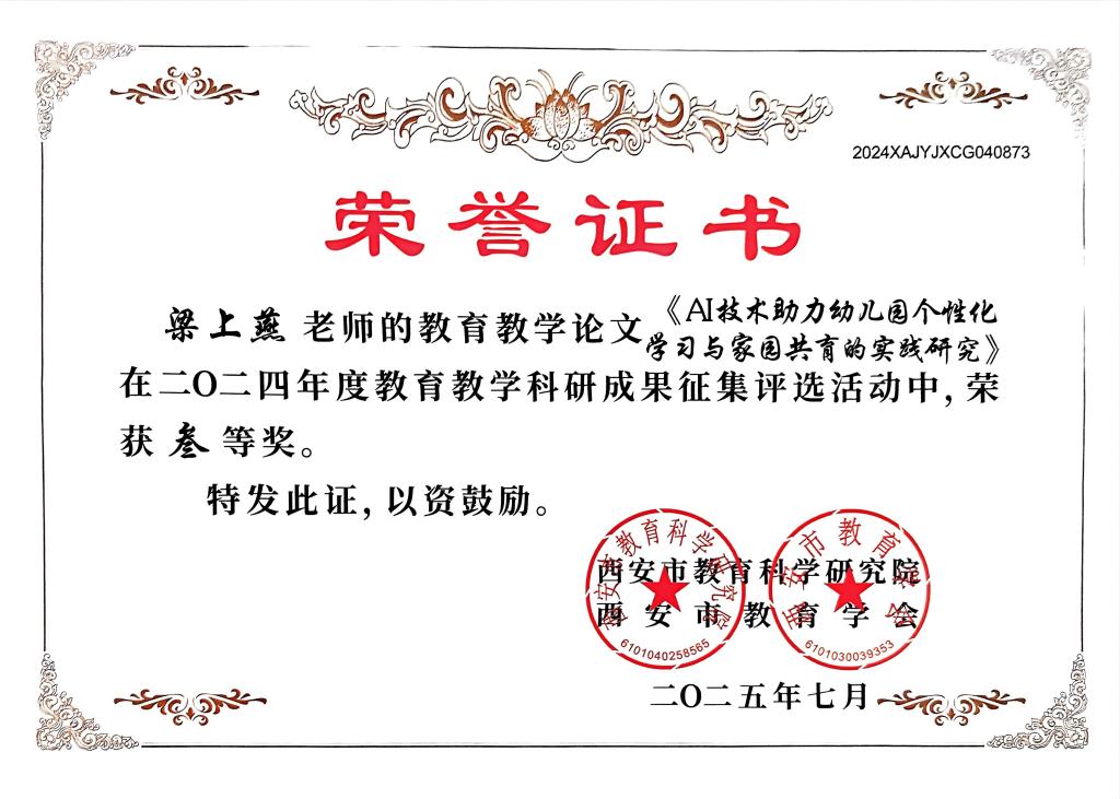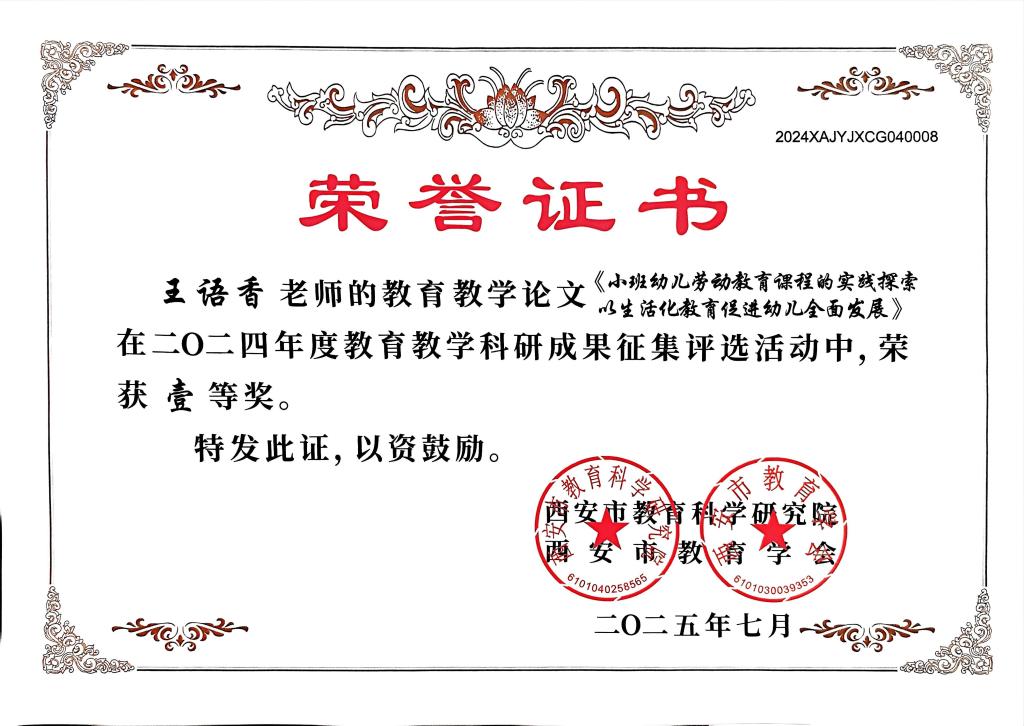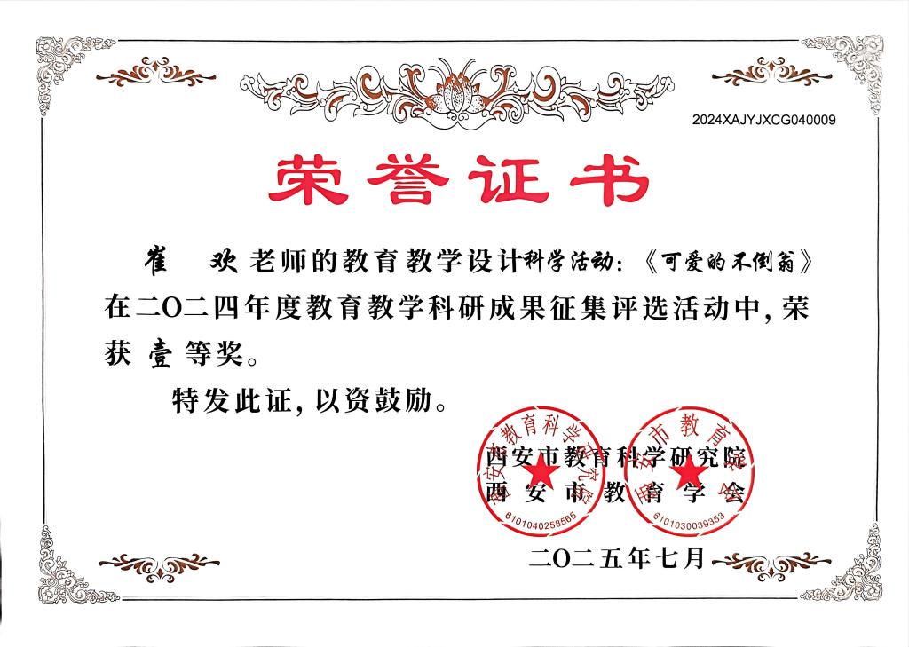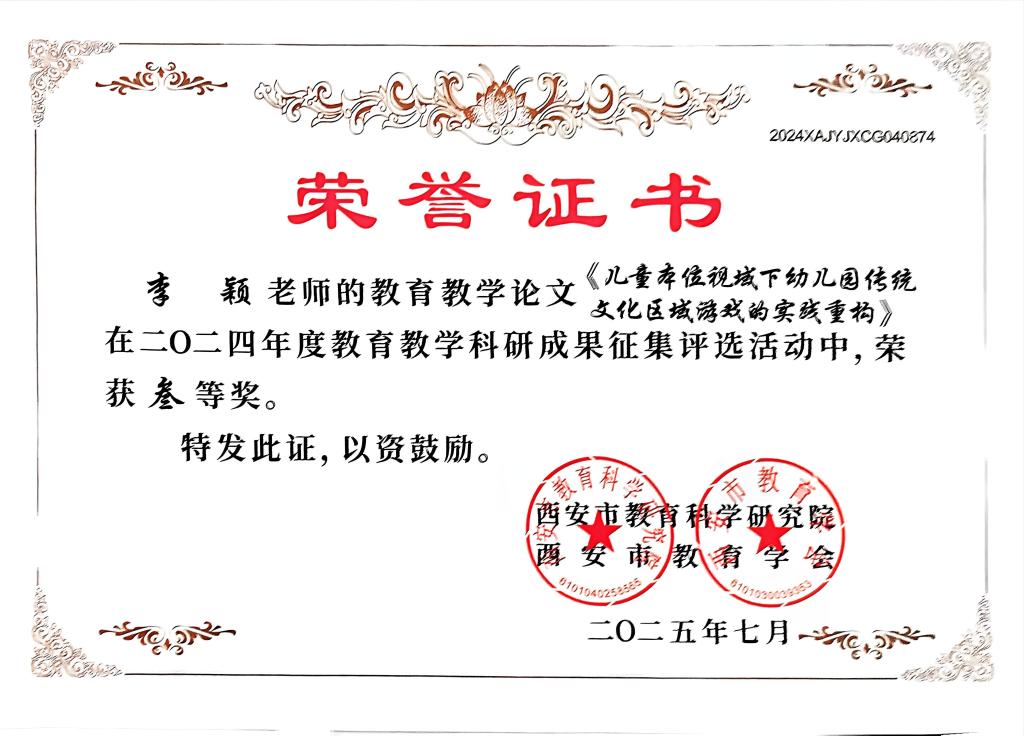 近日,西安市教育科学研究院与西安市教育学会联合组织的“深化教育学术系统化研究”2024年度教育教学科研成果征集评选活动结果揭晓。长安大学翠华幼儿园教师积极参与、表现突出,在多个领域的研究成果获得认可。经评审,在论文类别中,杨晓莉、王语香荣获一等奖;刘新艳荣获二等奖;李颖、梁上燕荣获三等奖;在教学活动设计类别中,崔欢荣获一等奖;辛钰荣获二等奖;张佳乐荣获三等奖。