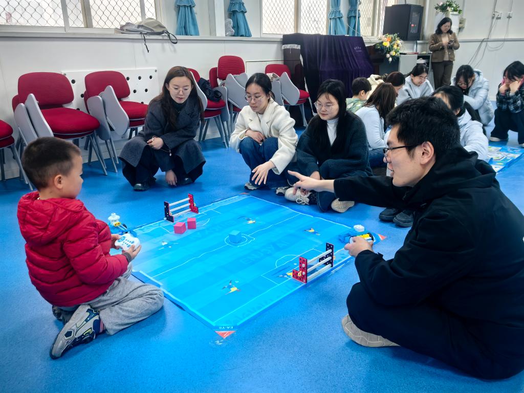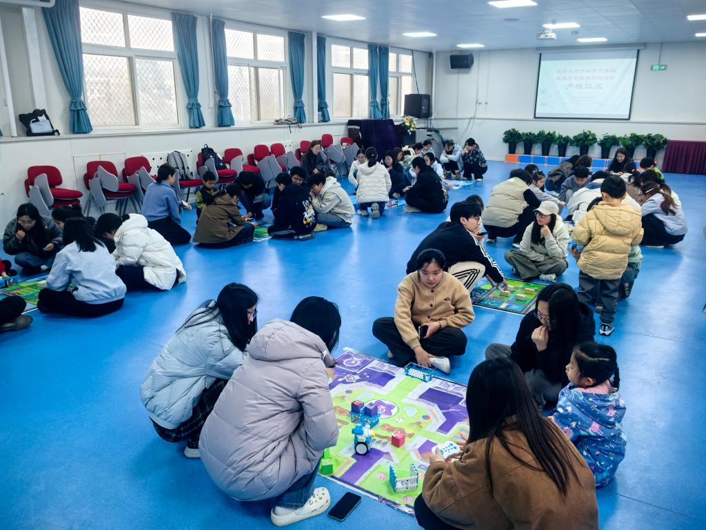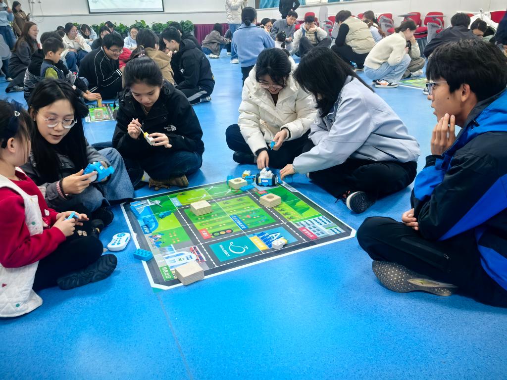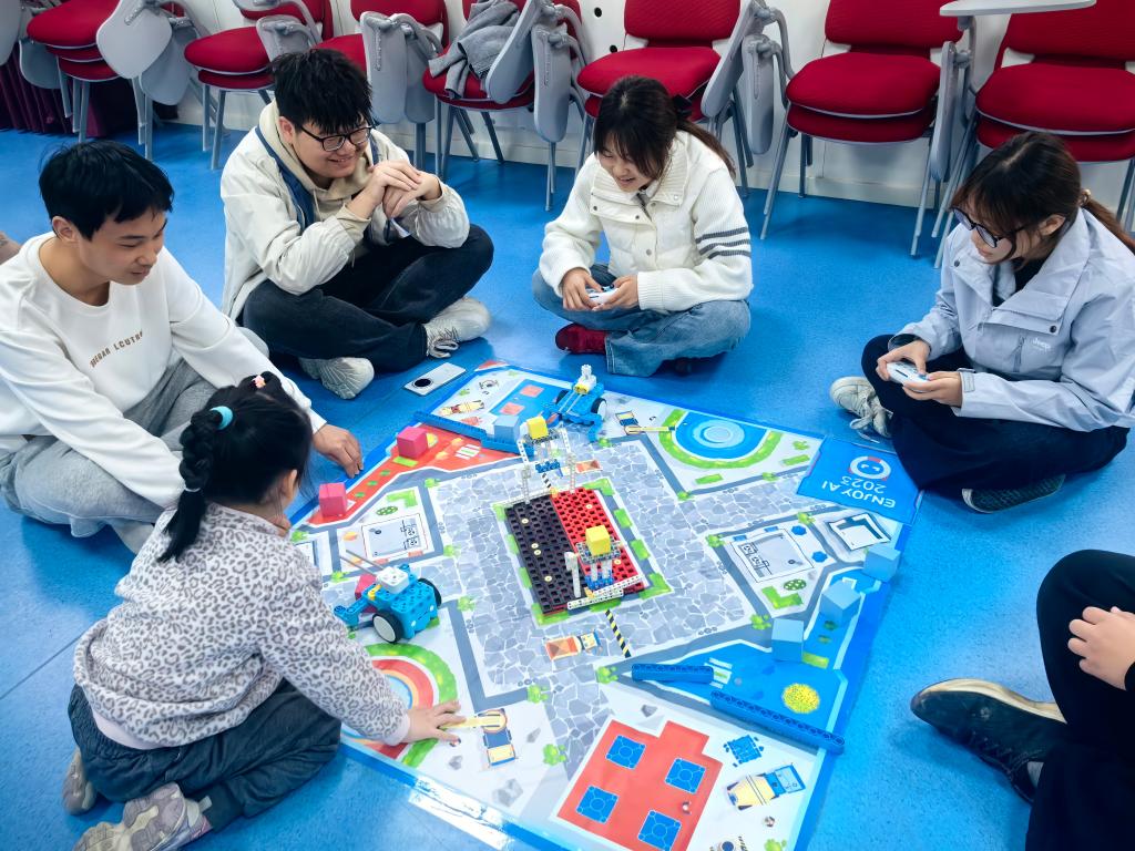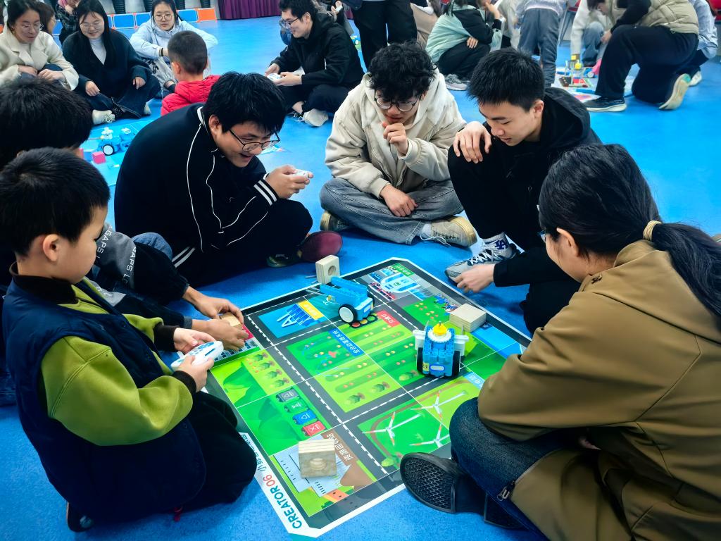 开班仪式结束后,乐高机器人体验活动正式开展。活动共设置八个体验区域,由幼儿担任小小引导员,大学生志愿者分组轮换参与。在轻松愉悦的氛围中,志愿者与孩子们一同动手拼搭、协作探索,在趣味互动中感受科技与游戏的魅力,为系列劳动教育实践活动拉开了精彩序幕。